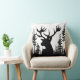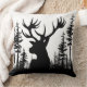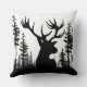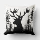 Ein winterliches Kissen mit einer schwarzen Silhouette eines großen Hirschkopfes in einem ruhigen Waldkiefernwald auf weißem Hintergrund.