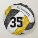 Dieses lustige Volleyballkissen für Mädchen mit individuellen Teamfarben zeigt das realistische, stylisierte Bild eines schwarzen, goldenen und weißen Volleyballs, das ein künstlerisches, blumenkalidoskopisches Muster mit schwarzen und goldenen Paneelen - personalisiert mit ihrem Namen und Jersey-Nummer - von katz_d_zynes hat