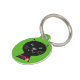 Schwarze Katze mit grünen Augen auf grünem Hinterg Haustiermarke