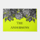 Diese cool aussehende Begrüßungsmatte ist bereit, mit dem Namen Ihrer Familie oder jedem gewollt Text personalisiert zu sein. Diese Türmatte zeigt die Abbildungen von Schwarz-Weiß-Rosen in einem antiken Gravierstil-Set vor einem hellen, elektrisch kalk-grünen Hintergrund.