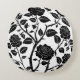 Schwarze Rose auf einem runden Kissen. Die Vorderseite ist ein Schwarzweißbild. Die Rückseite ist schwarz.