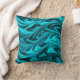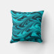 Ein Kissen mit einem vibrierenden blauen und schwarzen Muster in den Schatten des hellen Türkises schattierend zum Schwarzen in gebogenen gewellten Streifen, wie plätschernden Wellen, mit dunklerer Schattierung für einen Seide- oder Satinblick. Merken Sie bitte: dieses ist nicht Satingewebe aber ein Druckentwurf.