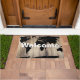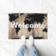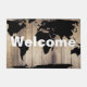 Diese Fußmatte ist für die gut gereiste Familie perfekt. Es ist schwarze Weltkarte wird silhouettiert über einem hellen rustikalen hölzernen Plankenhintergrund. Das Wortwillkommen ist in den weißen mutigen starken Buchstaben.