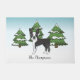 Desteis originelle Cartoon-Illustration eines niedlichen Schwarz-Weiß-Hundes der Boston Terrier Rasse. Der Hund ist in einer Winterlandschaft mit drei grünen Tannenbäumen und fallendem Schnee untergebracht. Der Hintergrund ist ein blaues bis weißes Gefälle, das das Design des kalten Wintertages verleiht. Es gibt auch einen personalisierbaren Textbereich für einen Namen.