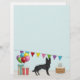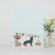 Desteis originelle Cartoon-Illustration eines bezaubernden, schwarzen Hundes der deutschen Schäferhunde. Der Hund ist in einer bunten Geburtstagslandschaft untergebracht. Es gibt einen Geburtstagskuchen mit ein paar Kerzen darauf, bunte Geburtstagsballons und ein buntes Banner sowie zwei Geschenkschachteln.