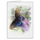 Schwarzer Schmetterling auf lila Blume mit Grunge Hintergrund leere Karte.