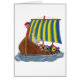 Blaue und gelbe Segel fliegen über dieses Wikinger-Schiff. Schilder schmücken die Seite. Seeungeheuer-Aufschläge am Helm.