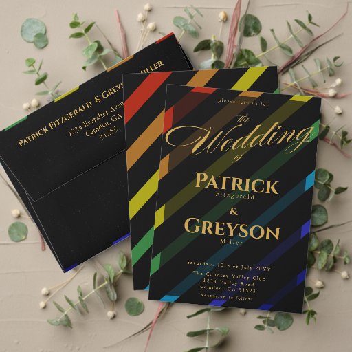 Dieses atemberaubende Weinlabel für die Hochzeit schwuler Männer zeigt elegante Regenbogenstreifen, die diagonal über ein anspruchsvolles Schwarz verlaufen, kombiniert mit luxuriöser Gold-Schrift-Typografie. Bold, männlich und unmöglich zu ignorieren – dieses Design erregt Aufmerksamkeit und feiert Liebe auf wunderschöne Weise. Perfekt für Einladungen, RSVPs, Save-the-Date-Karten und mehr. Vollständig personalisiert mit Ihren Namen und Hochzeitsdatum. Stechen Sie hervor mit einem Design, das so einzigartig ist wie Ihre Liebesgeschichte.