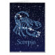 Karte mit dem Zodiaksymbol für Scorpio in weichem silberblauem Blau, überlagert mit den Sternen der Sterne, vor einem Sternenhimmel, der von tiefer Mitternacht blau bis schwarz gestuft wird.