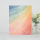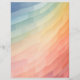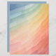 Ein lebendiger Farbverlauf von coolen Blues an der Spitze, über Grüntöne und Gelb, bis zu warmen Orangen und Pinks am unteren Ende. Die Komposition besteht aus geometrischen Formen, die ein Muster gekrümmter Linien bilden und ein Gefühl von Bewegung und Tiefe erzeugen.