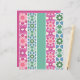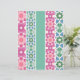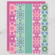 Eine Reihe von bunten geometrischen Mustern bilden ein symmetrisches Design, das an traditionelle Fliesenarbeiten erinnert. Jeder Streifen weist eine dominante Farbe wie Rosa, Blau oder Grün mit Aquarelltexturen auf, wodurch eine visuell harmonische Komposition entsteht.