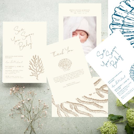 Diese einfachen, minimalistischen Einladungen mit Babydusche sind perfekt für schicke Feste mit Meeresmotiven! Sie enthalten Ihren eigenen Text in einer klassischen Typografie und stilvolle handgeschriebene Skripte für einen eingängigen Schiffstitel: Sea you soon, baby! Das schlichte Design ist mit einem hübschen Bild einer Jakobsmuschel-Muschel geschmückt, die eine Perle verbirgt, was dem ansonsten neutralen Ambiente, das für einen kleinen Jungen perfekt ist, ein maritimes und küstennahes Ambiente verleiht. Es ist eine natürliche, weiche und pulverblaue Farbe mit weißem Text. Erstellen Sie Ihre eigene, indem Sie auf den Button "Personalisieren" klicken.