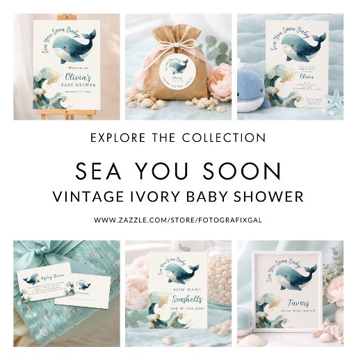 Sea You Soon Ocean Whale Baby Shower Teal writing on ivory. Easily personalise the text to your details. With a watercolor illustration of a whale and wave.