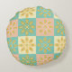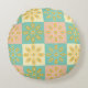 A seamless pattern with geometric floral motifs in yellow, pink, and teal on pastel squares, creating a vintage, harmonious, and cheerful design.