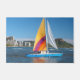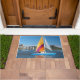 Diese Türmatte hat ein buntes Segelboot, das darauf abgebildet ist.