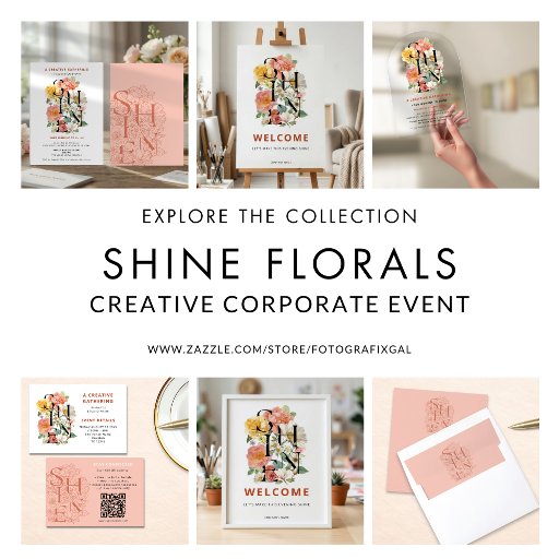 SHINE Floral Creative Corporate Logo Business Card. This elegant design features the fixed headline word “SHINE” layered within a lush, painterly floral arrangement for a bold yet refined statement. Perfect for a studio business card or event card for creative gatherings, studio launches, brand events, networking evenings, leadership conferences, and inspirational workshops. The central word “SHINE” is part of the artwork and not editable.