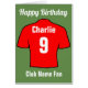Geburtstagskarte für einen Fußballfan. Personalisieren Sie die Geburtstagskarte des Fußballclubs mit einem Namen, einer Nummer und einem Namen für den Fußballclub. Rote Shirts.