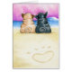 Aus Andies originaler Tinte und farbigem Bleistiftivgemälde: "Shore, das sind Möpsen der Liebe." Findet schwarze und braune Möpsen, die den Sonnenuntergang am Strand beobachten, nur wenige Schritte von einem im Sand gezeichnet Pfotenherz entfernt. c) Andie 2015.