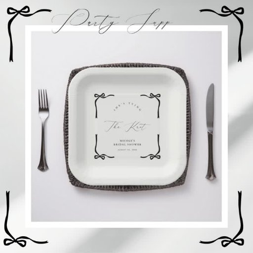 Stilvolle "She’s Tying the Knot" Teller mit einem schicken schwarzen Bogen und eleganter Typografie auf einem knackigen, weißen Hintergrund. Ideal, um Leckereien zu Brautparty, Polterabend oder Junggeselinnen-Abschied zu servieren, besonders für Schwarz-Weiß- oder Bogen-Veranstaltungen. Diese Teller machen die Bereinigung einfach und ergänzen Ihre Veranstaltungsdekoration durch eine koordinierte, moderne Touch. Pair mit passenden Bechern, Servietten und Beschilderung für ein vollständiges Aussehen.