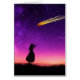 Ein lebhafter und farbenfroher lila Himmel im Abend der Dämmerung mit einer Himmelsdecke. Eine Silhouette eines Mädchens, das auf einem Hügel stehend ist und hoch in den Himmel schaut und dabei zusehen muss, wie ein glühender Meteor-Feuerball auf die Erde zusteuert, um abstürzen zu können.