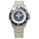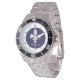 Diese klassische Edelstahluhr ist mit einem silbernen Fleur-de-lis auf dunkelblauem Hintergrund versehen, wobei schwarze Zahlen auf einem weißen Umfang die Zeit anzeigen. Personalisieren Sie Ihren Namen und wählen Sie eine andere Hintergrundfarbe aus. Wählen Sie eine andere Bandfarbe oder einen anderen Uhrenstil aus.