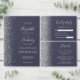 Die links Seite dieses eleganten, modernen Hochzeitsempfängerummantels zeichnet sich durch ein silbernes Imitat-Glitzer-Design aus. Der anpassbare Text kombiniert silbergraue Handschrift, Kupferplatte und kursiv Schriftart auf dunkelmarineblau-blauem Hintergrund. Die Rückseite ist mit einem dunkelblauen und silberfarbenen Glitzer-Design ausgestattet.