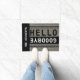 Personalisierte Hello Abschied-Doormat mit einem silbernen Glitzer Look Hintergrund.
