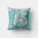 Fantastischer 15. Geburtstag geistenhaft Glam werfen Kissen für Ihre Tochter. Die Vorderseite zeigt die Zahl fünfzehn in einem puffigen Ballon Text Bild. Das Hintergrundbild ist mit einer gürtelartigen Glasur-Aqua-Cyan-und türkisblau ombre brushed Metal-Stil-Folie mit Imitaten silbernen Glitzer-Digital-Kunst-Grafik. Auf der Rückseite können Sie den Stil, die Farbe und die Größe des Schriftartes nach Bedarf anpassen. Die luxuriösen Glitzern, Glitzer und Folie werden mit kreativen künstlerischen Elementen kreiert, die wie ein Foto gedruckt werden.