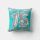 Fantastische Quinceañera mädchenhafte Glam werfen Kissen für Ihre Tochter. Die Vorderseite zeigt die Zahl fünfzehn in einem puffigen Ballon Text Bild. Das Hintergrundbild ist mit einer gürtelartigen Glasur-Aqua-Cyan-und türkisblau ombre brushed Metal-Stil-Folie mit Imitaten silbernen Glitzer-Digital-Kunst-Grafik. Auf der Rückseite können Sie den Stil, die Farbe und die Größe des Schriftartes nach Bedarf anpassen. Die luxuriösen Glitzern, Glitzer und Folie werden mit kreativen künstlerischen Elementen kreiert, die wie ein Foto gedruckt werden.