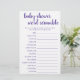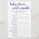 Entwirren Sie die Babyworte! Einfache Babydusche oder Geschlecht verraten das Wort Rührei-Party (mit Antworten unten) mit einem lustigen, lässigen, handgeschriebenen Drehbuch. Das klassische Design beinhaltet ein modernes, handhabbares Offerttipografie-Overlay. Für andere Farben oder passende Produkte, besuchen Sie bitte den JustFharryn Zazzle Store, oder kontaktieren Sie den Designer, c/o Fharryn@yahoo.com Alle Rechte vorbehalten. #bohochic #zazzlemade ANSWER KEY: Bib, Play Pen, Rattle, Cradle, Shampoo, Baby Gate, Blanket, One-sie, Diaper Bag, Stroller, Baby Monitor, Lullaby, Schnuller, Flasche