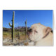 Ein photographisches Bild einer weißen englischen Bulldogge wird inmitten der eindrucksvollen Saguarokakteen in der Sonoran Wüste gezeigt.
