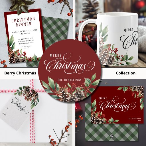 Weihnachts-Abendessen in Skript Einladung. Weihnachten ist ein Skriptdesign-Element und der kreisförmige Datumsrahmen hat zwei grüne Farbtöne vom Gingham-Muster auf der Rückseite. Die Formen machen diese Einladung Bio und fließend. Ein weinroter Rahmen und eine Aquarelldekoration aus heiligen Beeren, Grünpflanzen und Kiefernzapfen in der unteren Ecke. Die Rückseite hat ein grünes Gingham-Muster. Behalt deine Weihnachtsabendtradition lebendig und beeindrucke Familie und Gäste mit diesen Elementen. Sehen Sie sich die anderen passenden Produkte in dieser Kollektion für ein zusammenhängendes Thema an.