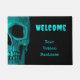 Beeindrucken Sie Ihre Kunden mit diesem coolen, trendigen, aquamarinen, schwarz-gotischen Schädel-Makabre, kreativen beruflichen Tätowierkünstlereingang matt dekoriert. Einzigartiger, beängstigender, moderner Vintager Stil, der die Schriftart-Farbe ergänzt. Bildrecht Marg Seregelyi Fotografie.