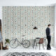 A whimsical circus-themed wallpaper with stripes, tents, balloons, and playful shapes, brought together in a warm, modern color palette designed for nurseries and boys bedroom.