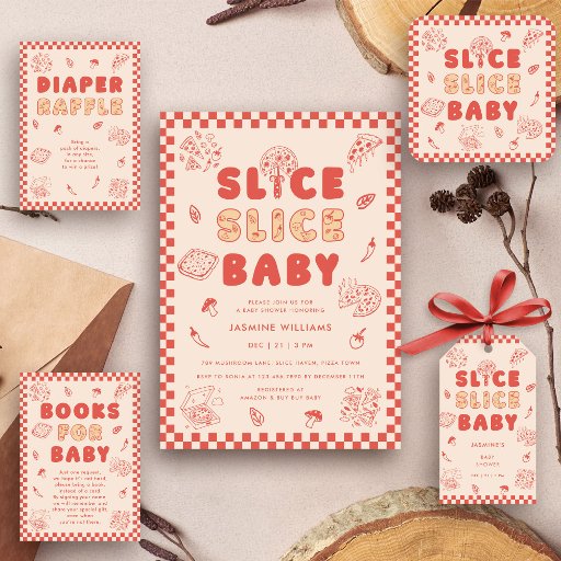 Diese hübsche Slice Slice Baby Pizza Hand Gezeichnet Baby Shower Invitation verfügt über einen spielerisch karierten Rahmen, der an eine klassische Pizzeria erinnert. Das fette SLICE SLICE BABY steht im Mittelpunkt der Bühne, umgeben von skurrilen, handgezeichnet Illustrationen von Pizzaslicen, frischen Zutaten wie Basilikum, Tomaten, Pilzen und Paprikaschoten sowie rustikalen Details, die eine gemütliche, in Italien inspirierte Touch hinzufügen. Ideal, um unterwegs ein wenig zu feiern, mit einem lustigen und köstlichen Thema! Bitte kontaktieren Sie uns in Touch für Design-Hilfe via Zazzle Chat. Wir werden sicher sein, innerhalb von 12 Stunden zu antworten.