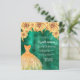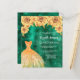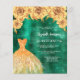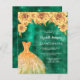 Eine moderne, stilvolle und glamouröse Einladung zu einer Quinceañera, 15. Geburtstagsfeier. Ein gestuftes smaragdgrünes Hintergrund mit einem goldenen Imitat ein Kleid und Rose, Blumensträuße. Der Name ist mit einem modernen handgeschriebenen Stilskript geschrieben. Personalisieren Sie Ihre Party-Daten und fügen Sie sie hinzu. 1 Blatt = 1 Einladung mit Druckkante bis Kante.
