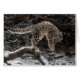 Schneeleopardenwabe springt von einem Baum, um in den Schnee zu springen.