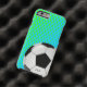 Benutzerdefinierter Fußballfan iPhone 6 Gehäuse, mit Grafiken eines blauen und grünen Punktmusters Hintergrund. Die Grafik einer Fußballkugel schmückt die untere rechte Ecke des Gehäuses, und der schwarze Text am unteren Rand ist personalisiert. Großartiger Telefonkasten für Sportfans oder Fußballspieler.