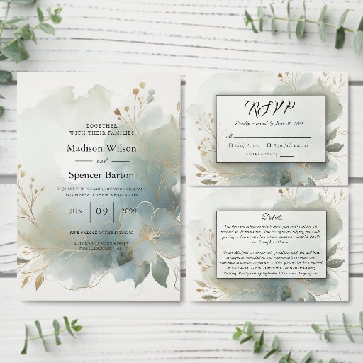 Mit dieser geschmackvoll gestalteten Hochzeitseinladung aus der Kollektion Soft Golden Dusty Blue Romance laden Sie Ihre Gäste in zeitloser Eleganz ein. Mit sanften Wasserfarben-Waschbecken in staubblauem und schlauem Grün, ist dieses Design mit anmutigen goldenen Blumenbildern für ein elegantes, modernes botanisches Ambiente behaglich. Die sanfte Farbpalette und der dezente Schimmer machen es zu einem idealen Ort für romantische Gartenhochzeiten, hochklassige Soirées oder für jede Feier, die von dem Charme der Natur berührt wird. Diese Einladung ist mit Ihren Veranstaltungsdetails vollkommen anpassbar und ist eine ruhige und stilvolle Art, Ihren großen Tag zu verkünden.