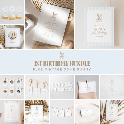 A classic vintage bunny design with soft blue bow detail and elegant neutral typography. Clean, timeless layout with a subtle stripe background—perfect for a boy’s first birthday party or a gender-neutral bunny celebration.