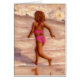 Junges Mädchen im rosa Swim-Anzug, der durch Brandung läuft.