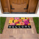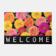 Die hübschen Sommerzinnien auf dieser Begrüßungsmatte blühen in Rosa, Gelb, lila, Orange und Rot auf schwarzem Hintergrund. Der untere Rand hat einen schwarzen Streifen mit dem Wort "Willkommen" in weißem Text. Ideal für alle, die Blume Liebe! Entworfen von weltberühmten Künstler ©Tim Coffey.