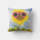 Rosa Sonnenbrille auf Sonnenblumen im Feld der Sonnenblumen mit Sommerhimmel Hintergrund. Die Rückseite des Kissens ist gesteppt gelber Gingham. Das Quiltmuster wird digital gerendert.