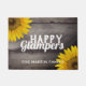 Land Chic, rustikales Wohngestaltunggeschenk des Spaßes für rvers, zog sich Straße Trippers, Wanderer, Lagerbewohner zurück, und Naturliebhaber, die noch personalisierte hölzerne Blickfußmatte einigen Geschöpfkomforts genießen, liest "glückliches Glampers" in einer Mischung der rustikalen und eleganten, weißen Beschriftung. Textschablone für Familiennamen unten addieren in den weißen, modernen Buchstaben. Gegen ein Hintergrund-Foto von rustikalem, beunruhigt, hölzerne Bretter der Scheune, die an den Rändern verdunkelt werden. Gelbe Sonnenblumen des Landes schmücken gegenüber von Ecken. Reizendes Ruhestandsgeschenk, auch und Blumenlandherbstdekor. Seien Sie zu Hause vor einem RV oder einem gemütlichen Blockhaus recht.
