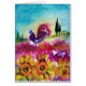 Farbenfrohe, skurrile toskanische Landschaft mit Blume und schwarzem Hahn in Gelb, Rot Fuchsia, Grün, lila, Blau. Akryles Gemälde auf Leinwand.Cool, künstlerisches Design für Sommerferien, Wiedersehen, Jubiläum, Geburtstagsfeiern oder für jede Veranstaltung, die Sie sich wünschen !