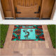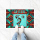 Dies ist ein einzigartiges "Eine von einer Art" Südwesten Kokopelli Doormat! Es besitzt einen Kokopelli, der die Flute spielt und unter der Sonne auf einem türkisfarbenen Hintergrund tanzt...Umgeben von einer Südwestgrenze in Türkis, Orange & Schwarz.