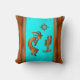 Brighten Sie Ihre Zuhause mit diesem "One of a Kind" Südwest Kokopelli Kissen! Es besitzt einen Kupfer im Südwesten Kokopelli, der die Flute spielt und um einen Kaktus unter der Sonne tanzt, auf einem türkisfarbenen Hintergrund...umgeben von einer Kupfergrenze !