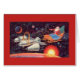 Diese Spaß Weihnachtskarte kennzeichnet ein Vintages sowjetisches Propagandabild von Weihnachtsmann reisend durch Raum mit den sowjetischen Raumschiffen, die seinen Sleigh ziehen. Löschen Sie nach innen.