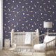Niedliches und lustiges Raumdesign mit bunten Monden, Raketen, Planeten und Sternen auf einem blauen lila Hintergrund. Ideal für ein Jungenzimmer, ein Kinderzimmer oder ein Spielzimmer.