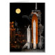 Das Space Shuttle Discovery befindet sich auf dem Launchpad 39A im Kennedy Space Center in Cape Canaveral Florida. Ein fast Vollmond leuchtet am Nachthimmel, um einen dramatischen Hintergrund hinzuzufügen.